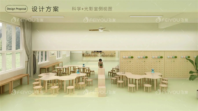 活泼、灵动、天真每一个小朋友心中都住了一个小怪兽,他们调皮捣蛋,他们机灵可爱......我们将小怪兽的元素融入家具的造型设计中,选用黄绿蓝三种色系,来打造孩子们心中的小怪兽世界。效果展示教室空间布局面积:160m2针对不同的主题教室,三种色系可以自由搭配,让教室变成了洋溢的梦幻世界。 -