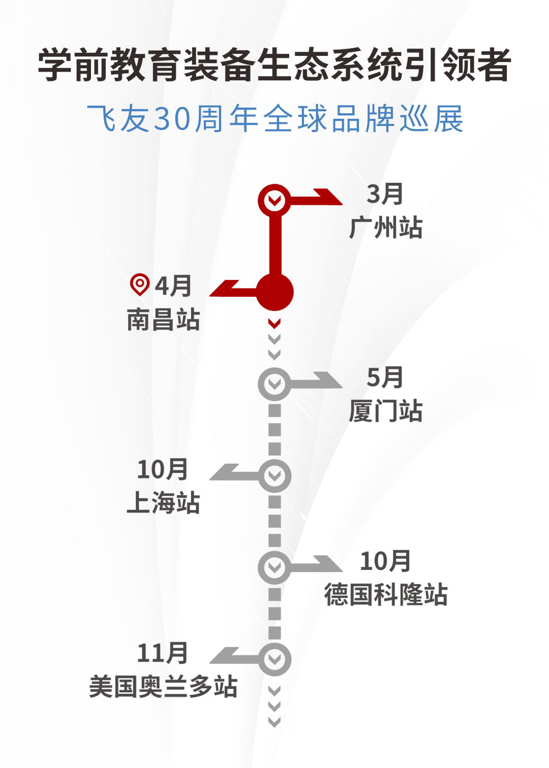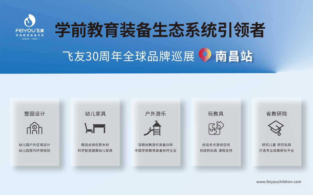 本次飞友30周年全球品牌巡展,首次集成“整园设计、幼儿家具、户外游乐、玩教具、省教研院”五大板块整装亮相,充分展示了飞友在学前教育装备研发智造上所取得的系列成果,为广大参展客户带来全新的观展体验。