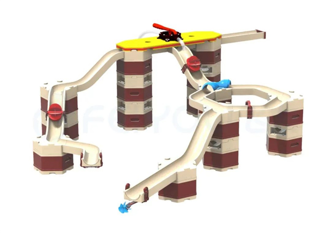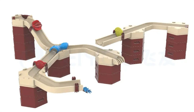 游戏建议:主要安置在六边形三通上盖,游戏中通过高低轨道落差下的水流,迎上水浪花形成两个分流水卷浪。让幼儿感受到高度对水流的影响以及水流的形态变化。