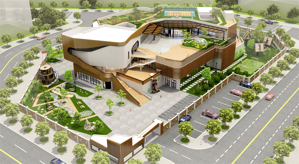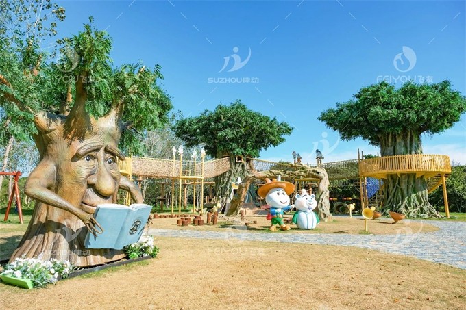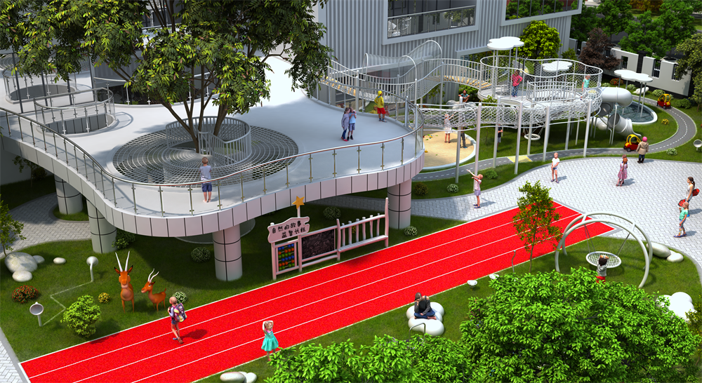 设计理念: 乌托邦意味着理想的国家,我们想把最美好的地方,最理想的儿童空间留个童年,在这里可以释放天性,在这里可以无限发挥创造,乌托邦式的儿童空间也是美好至极。 设计亮点: 设施由连廊相连的四个树屋阳光房,营造幼 -