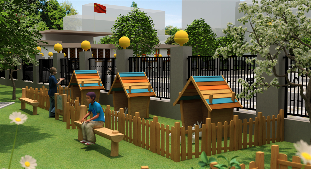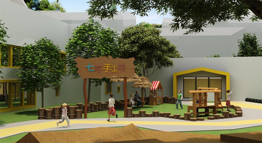 冰川幼儿园以几何元素为主题,结合建筑造型,对建筑元素进行延伸运用。以几何做造型,以地形为互动元素,勾勒出特色的主题园。小树与大树为构图元素,利用林间穿梭的水池,灌木等元素做承托,整个幼儿园呈现一幅生生不息的自然画卷。
