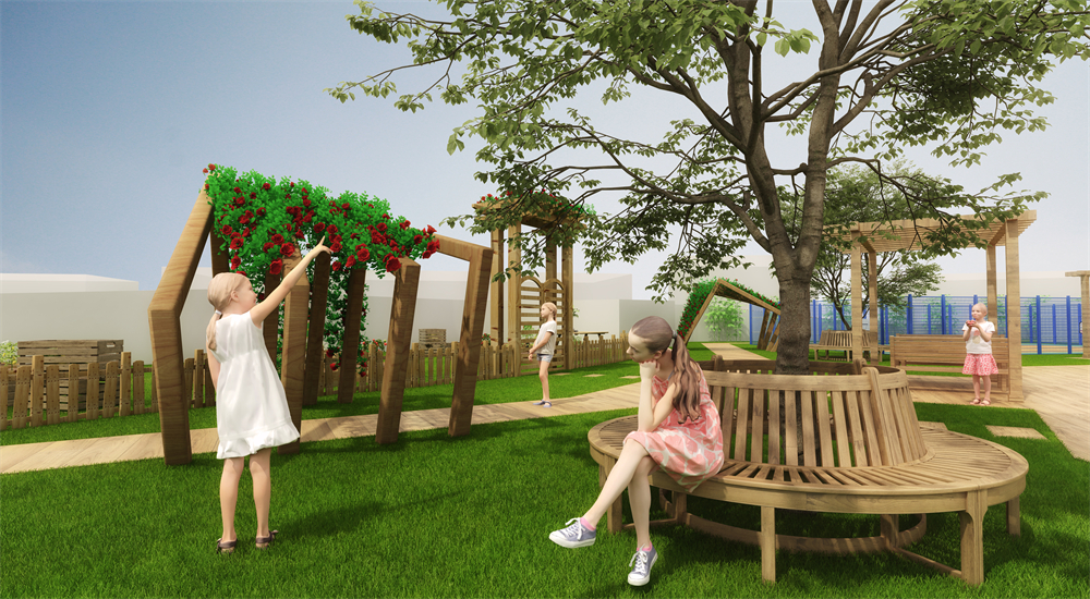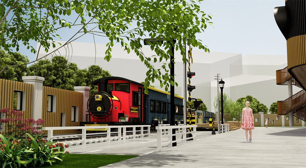 设施由连廊相连的四个树屋阳光房,营造幼儿游戏休闲互动场景,将自然生活与游乐空间相融合。