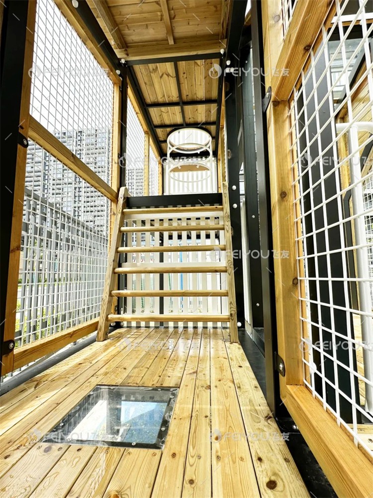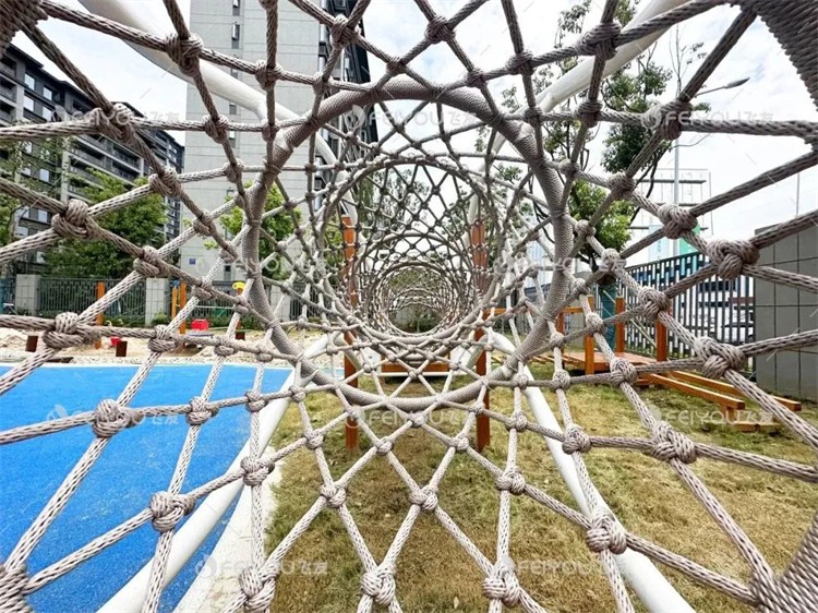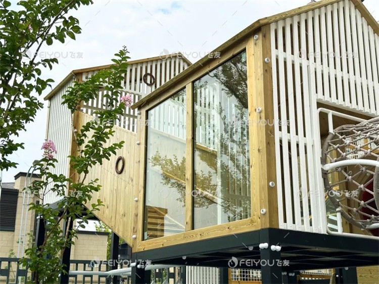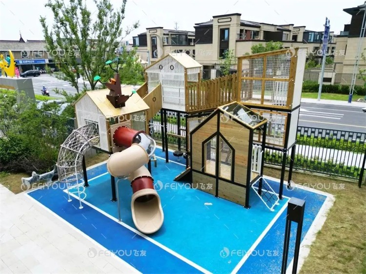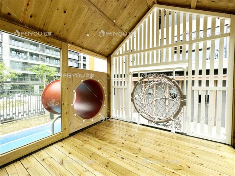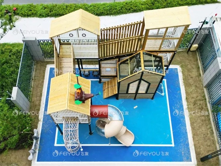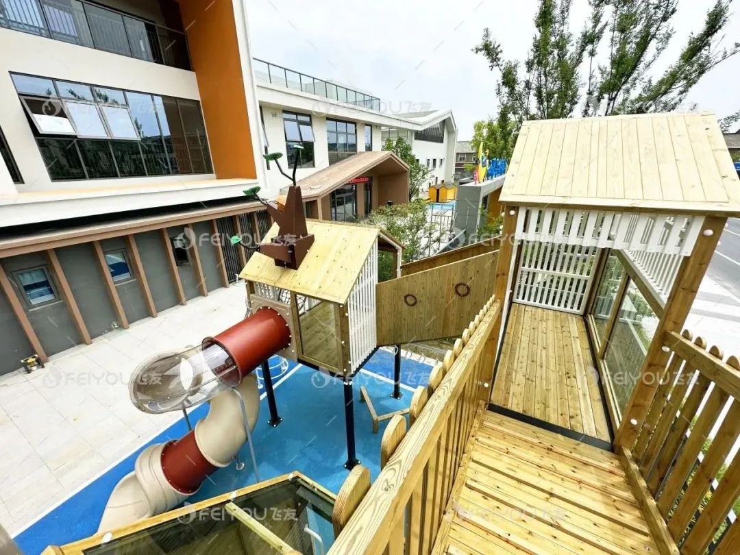 树屋主题组合滑梯是户外空间其中的一大亮点。设计师通过不同高度和结构的树屋设计,帮助孩子们锻炼空间感知和身体协调性。