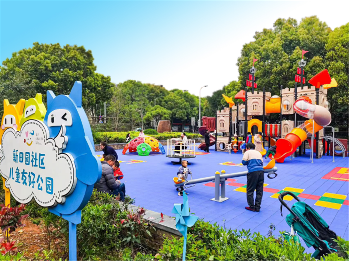 低龄儿童区的摇摇车和转盘车设在休息区和健身器材附近,方便家长随时看顾。