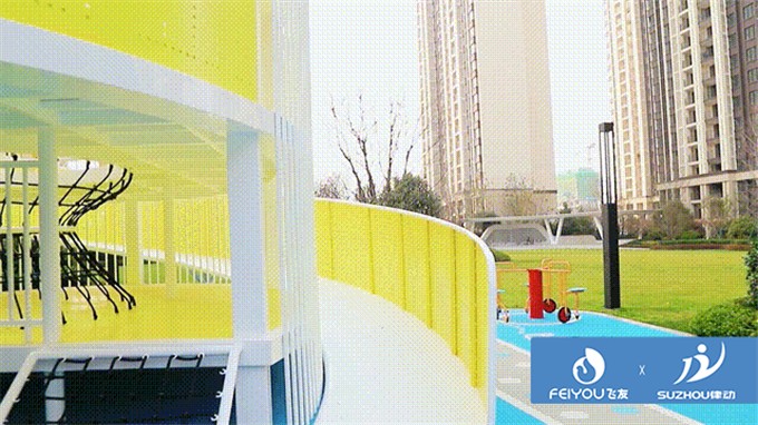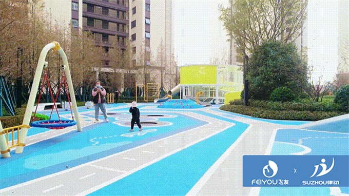 场地中间设置的平地蹦床,不突兀,不磕绊,预留安全距离,孩子们走上去就可以活动起来。