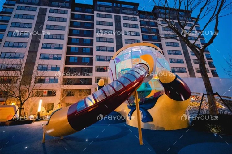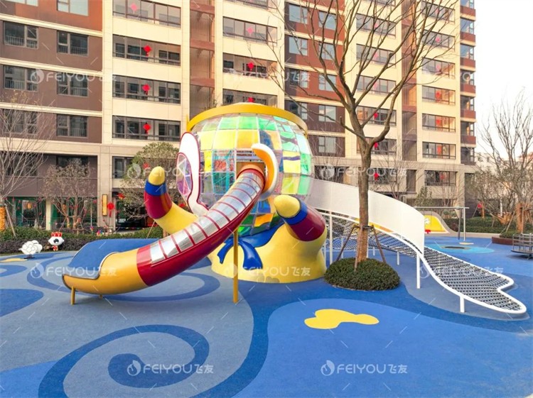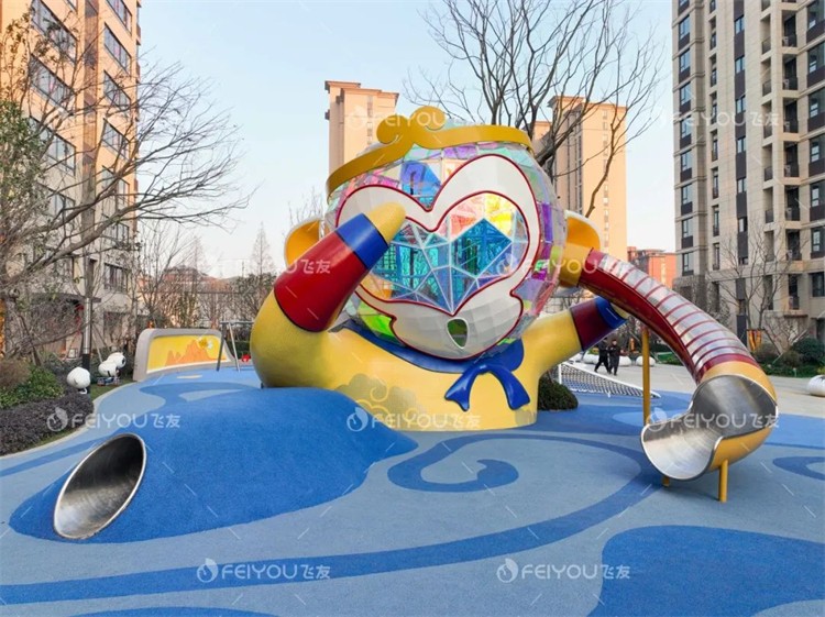 位于扬州金地华著小区内的悟空乐园,中心位置矗立着一座独特的悟空组合滑梯。它右手高举,目光远眺,仿佛在与小朋友们嬉戏互动,又似在默默守护着这片儿童的天堂。